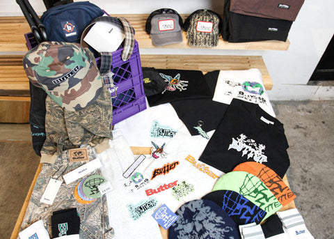 - accessories, backpack, butter goods, hats, jeans, pants, shorts, socks, stickers, tshirts