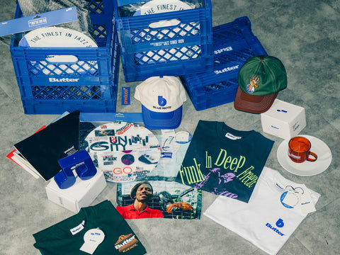 • blue note, butter goods, butter goods x blue note, hats, record crate, tshirts, vinyl record